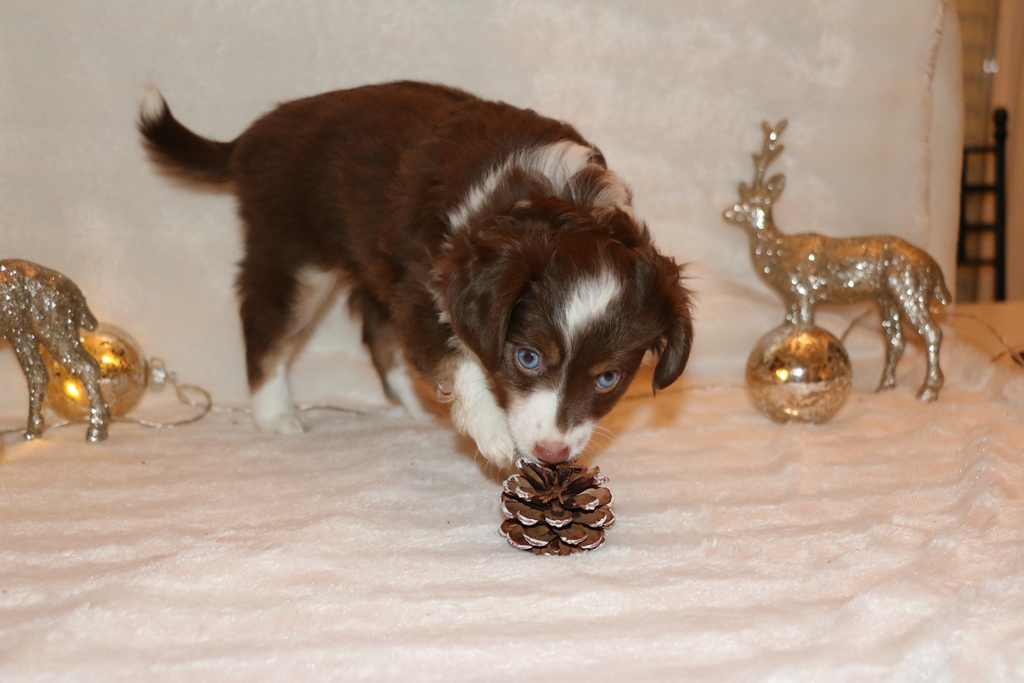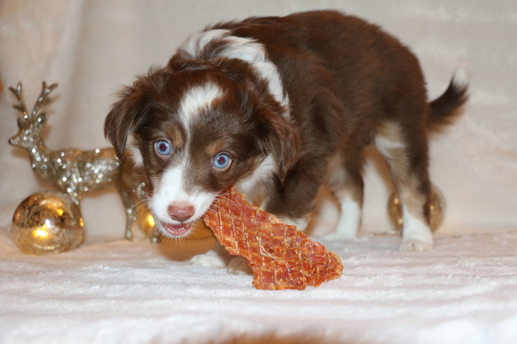 Der kleine Pinocchio ein süßer Fratz, er kam als Fünfter um 9.40 Uhr aus unserer Snow gepurzelt. Er wog 250 Gramm, unser kleiner bluemerle Rüde. Er hat eine weiße durchgehende Blesse und einen halbseitigen weißen Kragen. Vorne beidseitig weiße Stiefelchen. Pino ist ein kecker lustiger Welpe, bei den Fotos wollte er nicht wirklich still halten, die Milchbar bei Mama war viel spannender. Unser kleiner Pino mit 21 Tagen wiegt er 1190 Gramm, hat sehr kräftiges Kupfer und dunkles Merle. Bei der letzten Fotosession war er voll dabei, er macht einfach Freude.