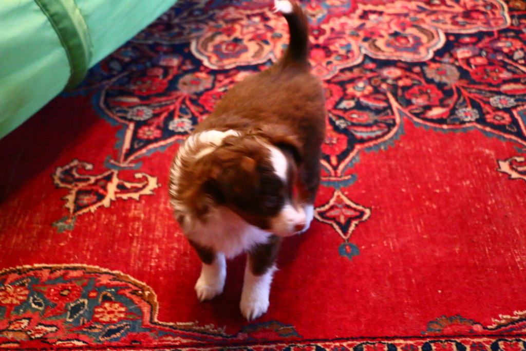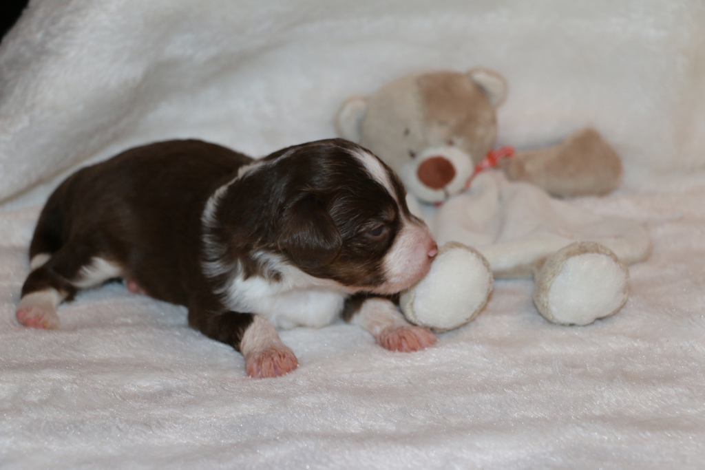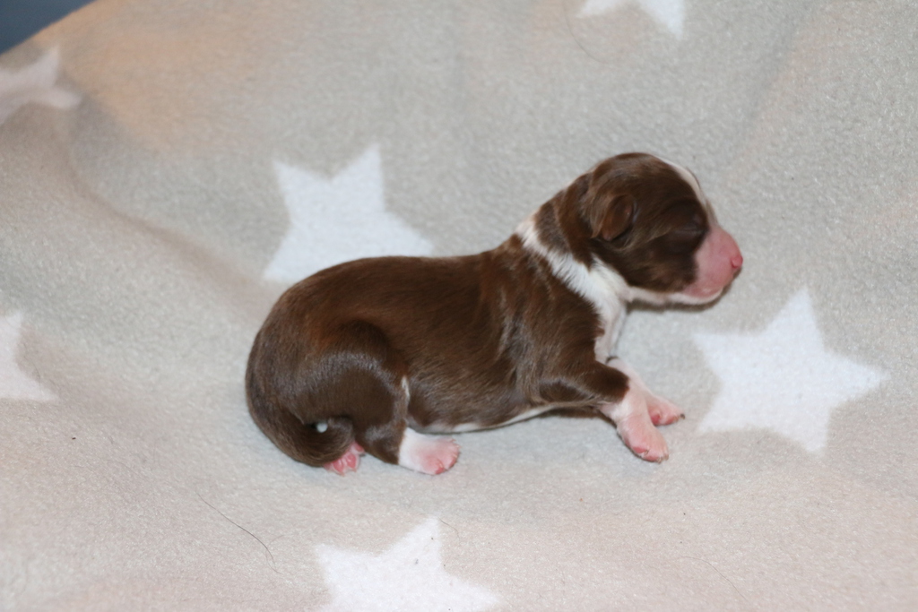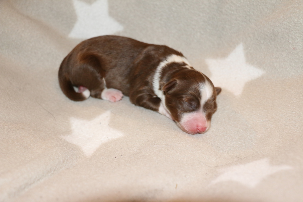 Sie kam 9 Minuten später als ihr Bruder um 4.15 Uhr zur Welt. Eine Redtri Hündin mit einem Geburtsgewicht von 225 Gramm. Sie hat eine breite Blesse und einen halbseitigen großen weißen Kragen. Vorn hochweißgestiefet und hinten Söckchen.