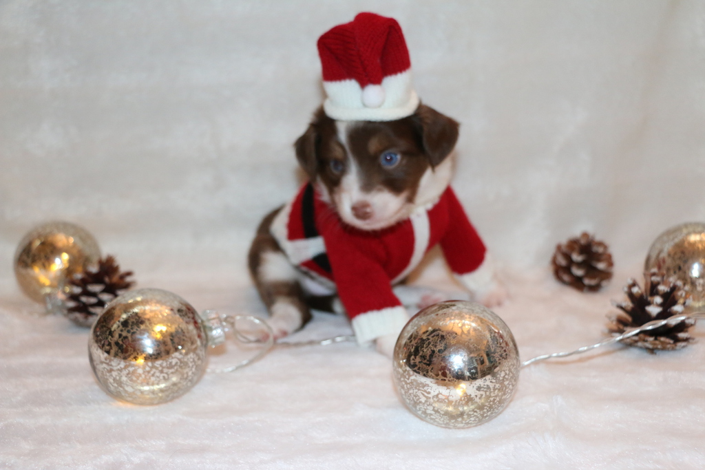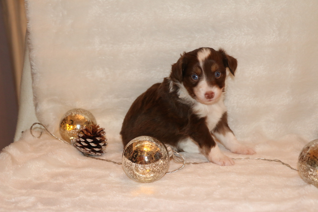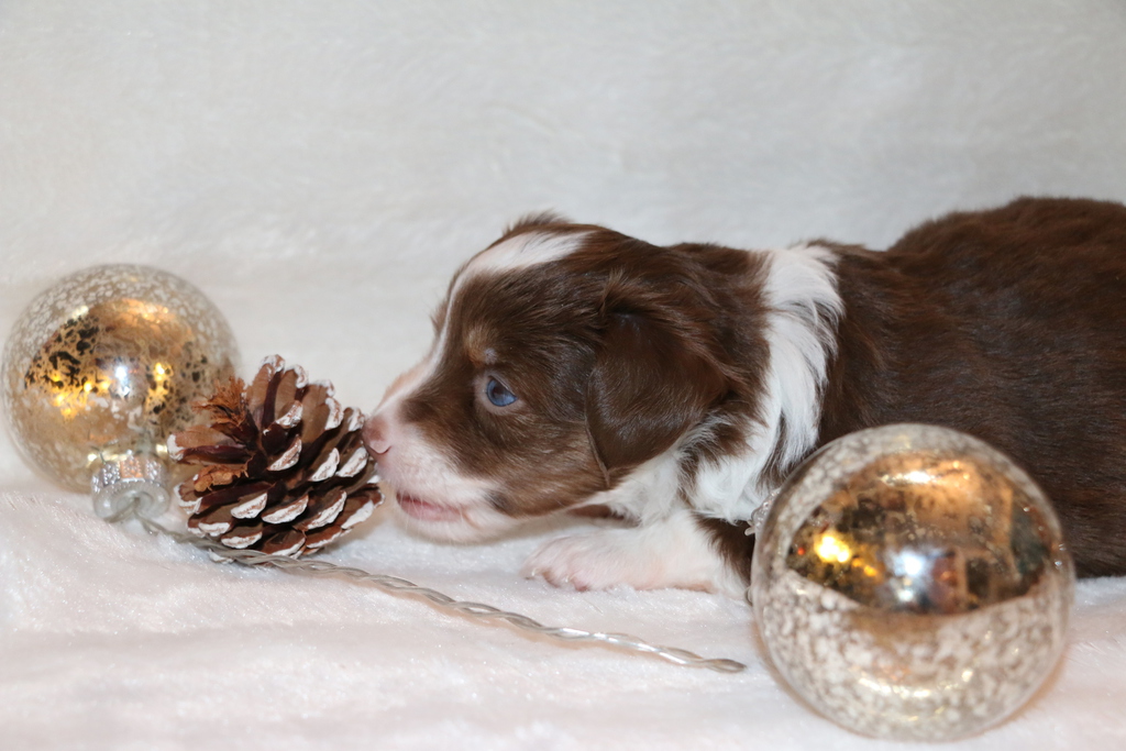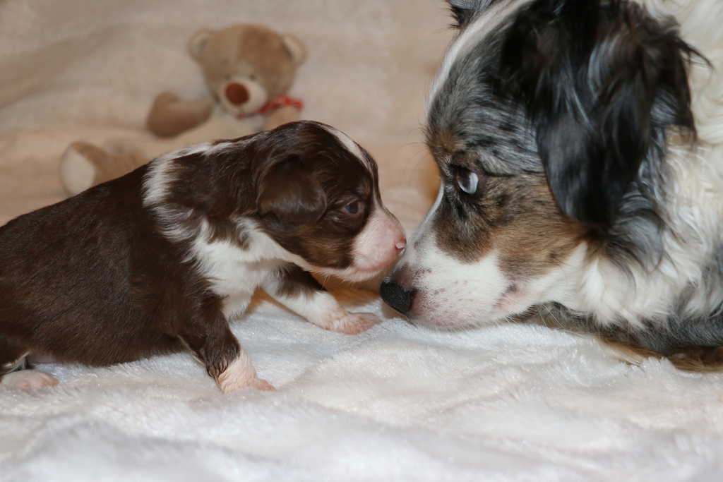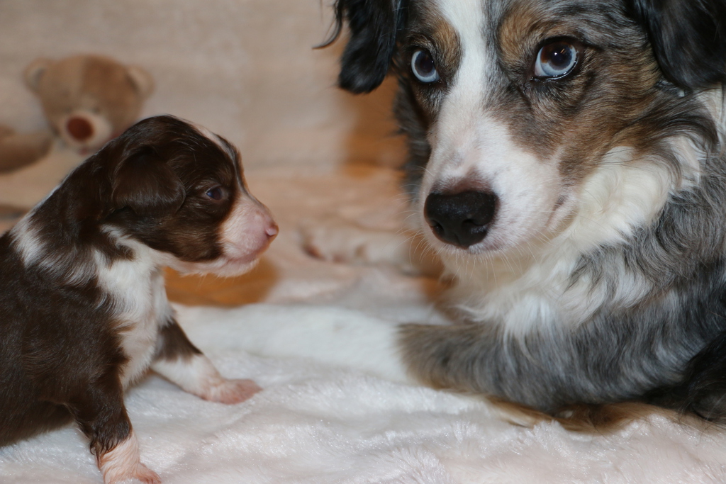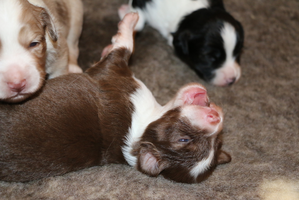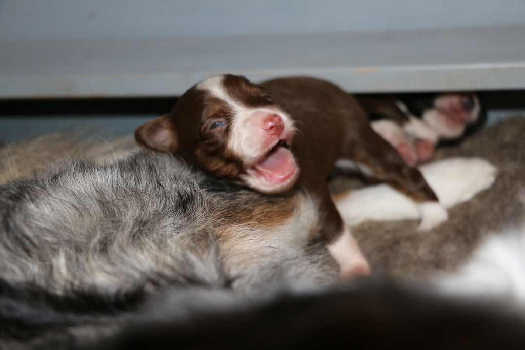 Khaleesi aus dem Hause Targaryen wog bei der Geburt 252 Gramm, eine absolute Schönheit. Eine Bluemerle Hündin, sie hat zwei weiße Stiefelchen vorne und Kniestrümpfe hinten, sowie eine gleichmäßig durchgehende Blesse mit vollem weißen Kragen.
