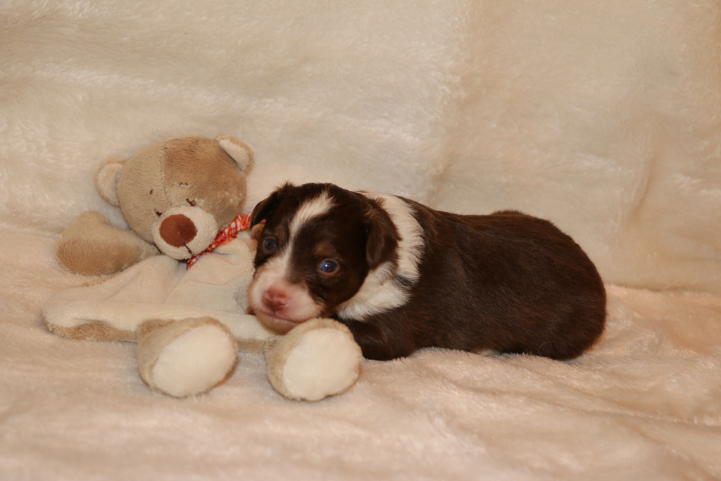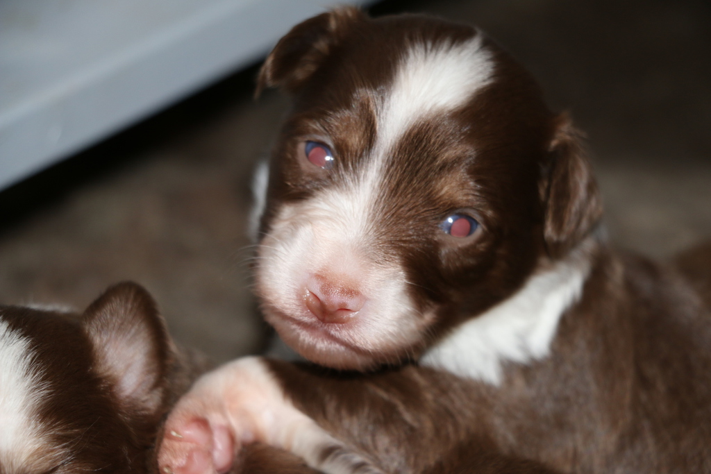 Robin Hood ist der Zweitgeborene, ein bluemerle Rüde und er kam Punkt 8.00 Uhr auf diese Welt. Eine Punktlandung, ein Volltreffer. Er wog 294 Gramm und ist wunderschön gezeichnet. Er hat eine durchgehende breite Blesse, einen vollen Kragen, rechts hoch weiß gestiefelt und links ein weißer Kniestrumpf. Ein aufgeweckter, schicker kleiner Kerl. Mit 21 Tagen wiegt Robin Hood nun 1270 Gramm, er zeigt schon sehr gutes Spielverhalten und wird immer hübscher, hat dunkles Merle und schon kräftiges Kupfer.